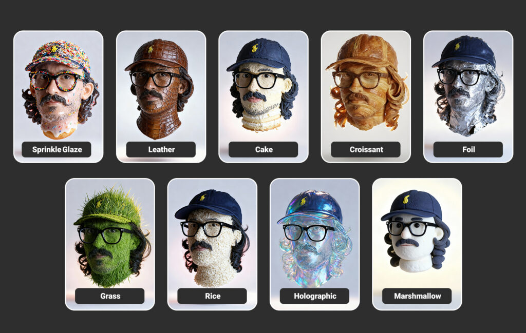 Photorealistic floating human head sculpted entirely from compressed rice grain texture, modeled after the reference: preserve exact human facial features, proportions, angle, and perspective. The entire head, including eyes, glasses, hair, and cap, is formed from densely packed rice grains, creating a cohesive organic surface with visible grains, subtle color variation, matte texture, and natural imperfections. Facial features are shaped through grain density and surface depth rather than material change. Tightly cropped to only the head, no neck or body, suspended mid-air against a seamless isolated neutral pale gray gradient background. Soft diffused rim backlight to emphasize texture and silhouette; gentle front fill to retain expression clarity. No visible supports; include a faint soft shadow beneath to imply levitation. Ultra-high resolution, studio-quality, fully rice-crafted human head